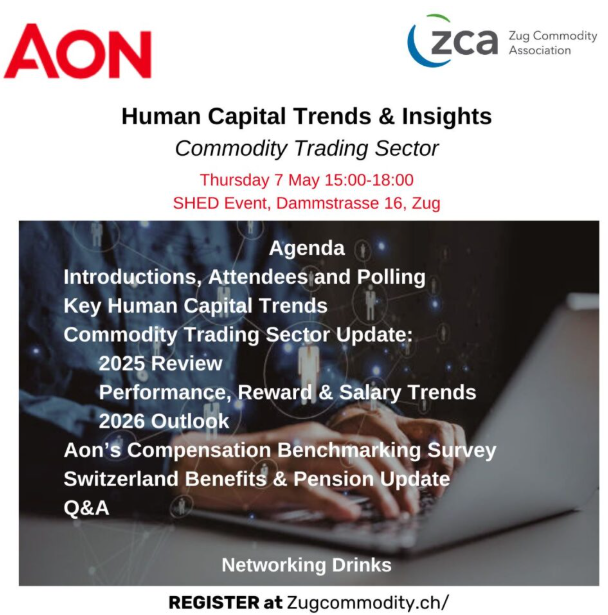 On 7 May 2026, the Zug Commodity Association (ZCA), in collaboration with Aon, will host a focused industry session on Human Capital Trends & Insights in the Commodity Trading Sector.